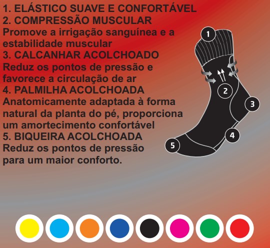 O uso de Meia Baixa de Compressão facilita o retorno venoso, auxiliando a remoção de metabolitos resultantes da atividade física, e aumenta a oxigenação muscular, melhorando a resistência. Permite maior estabilidade, reduzindo potenciais dores musculares.
